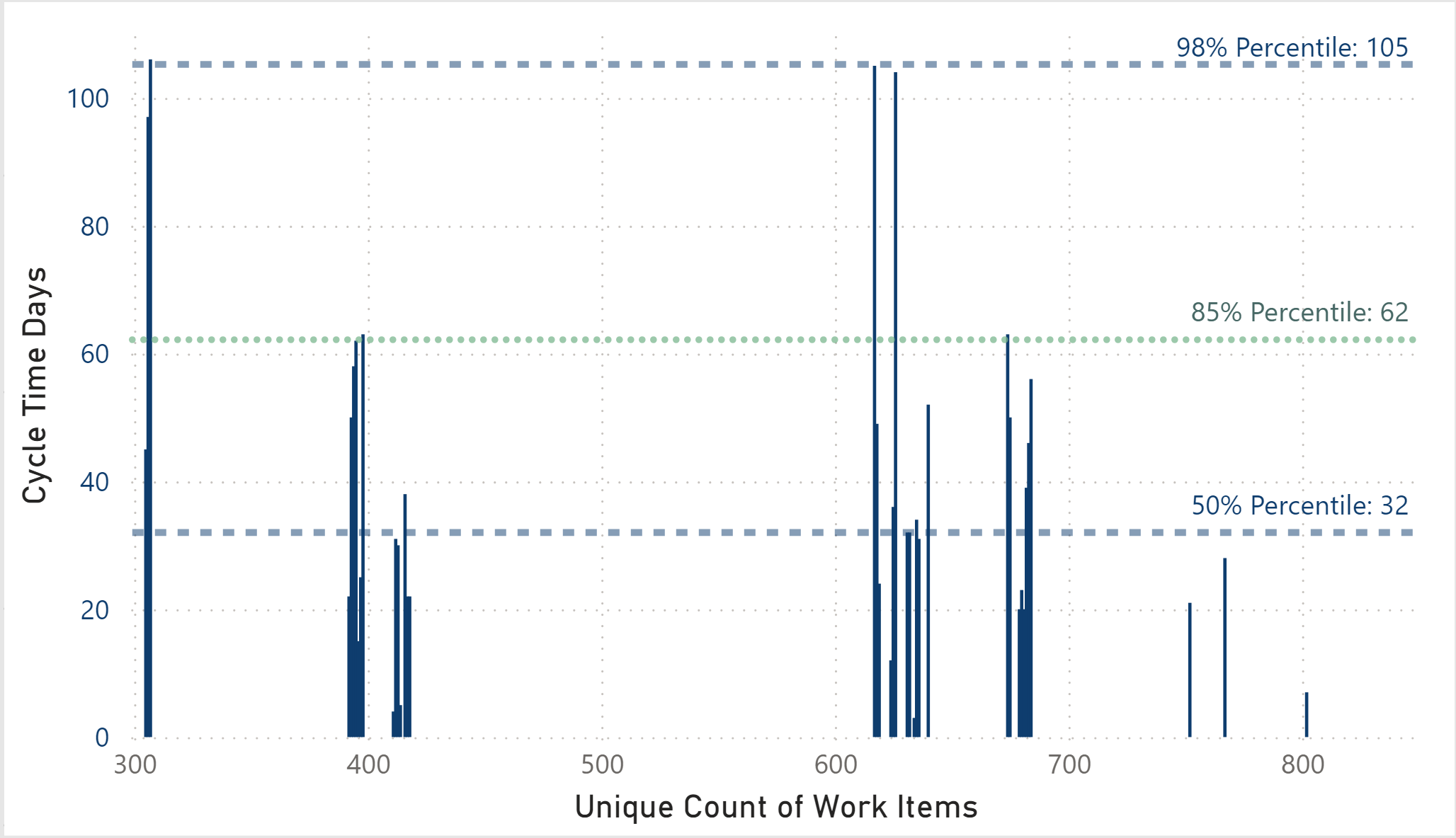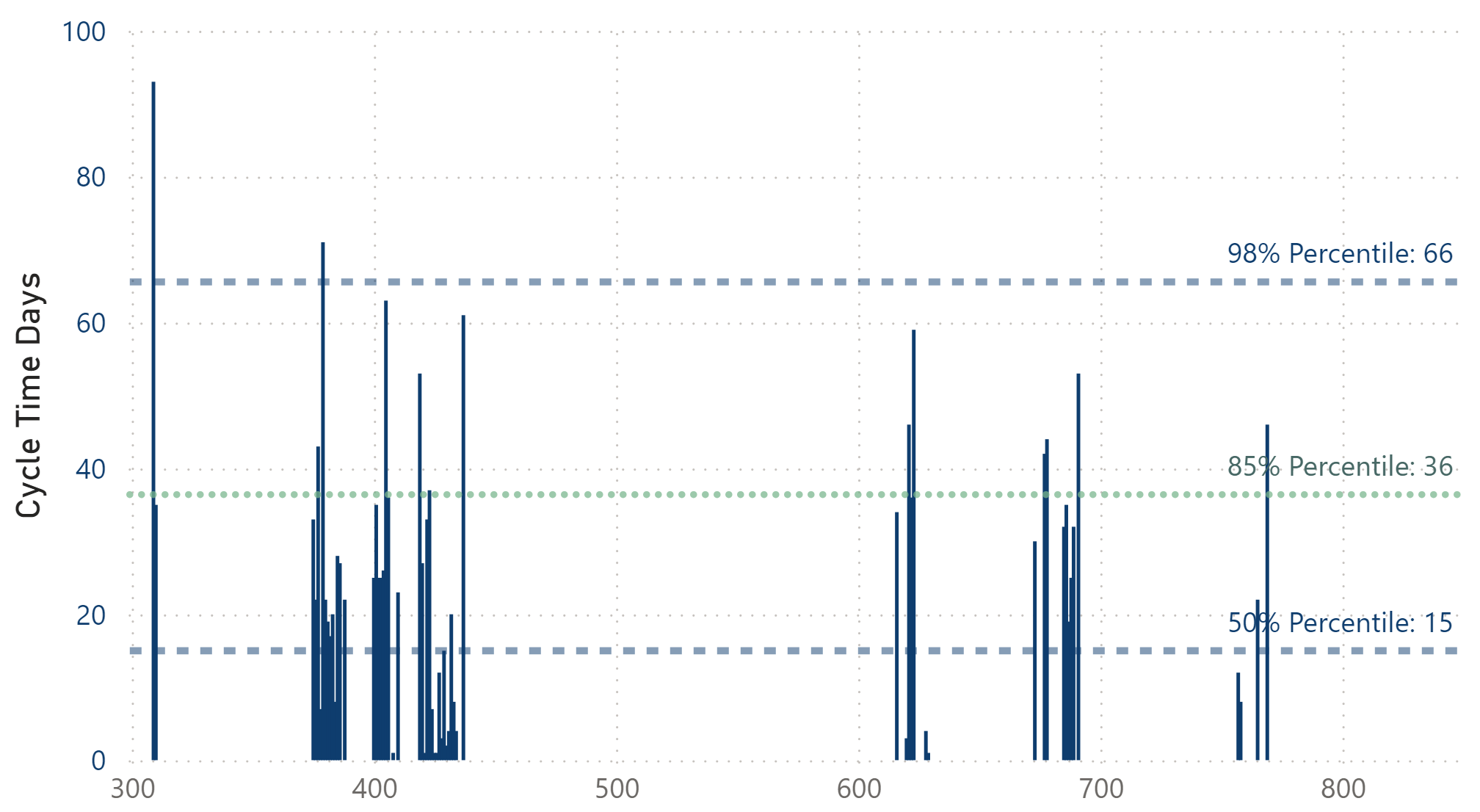 The variability in lead times, with the 50th percentile at 32 days, the 85th percentile at 62 days, and the 98th percentile at 105 days, suggests a broad range of completion times for different tasks. This scatter in cycle times, as depicted in the distribution plot, is typical for teams still refining their workflow and adjusting to new methodologies. These initial metrics serve as a baseline to understand current performance and identify areas for improvement as the team matures and optimizes their processes.