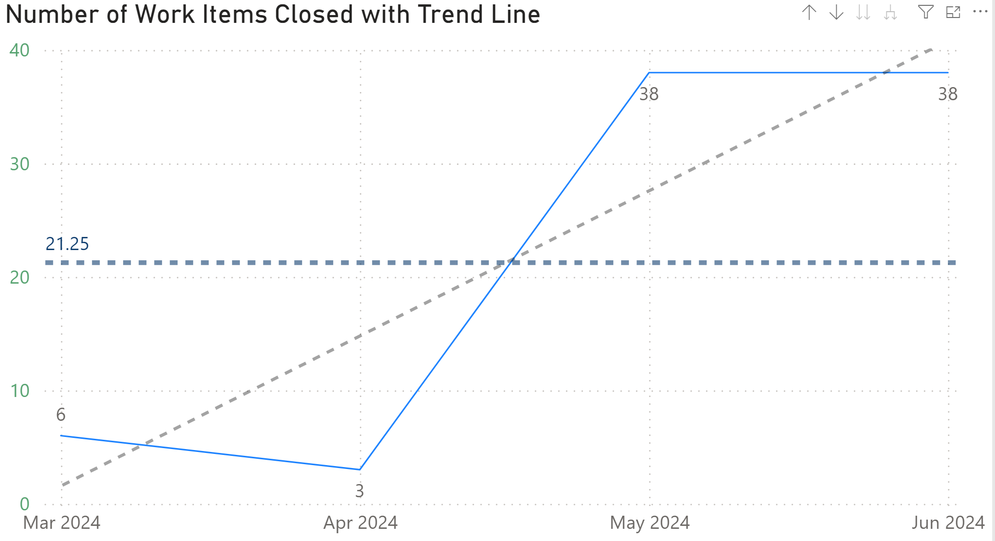 The initial metrics for March 2024 provide insight into the early stages of this newly formed team’s workflow. The average system lead time of 40.72 days indicates that tasks are currently taking a considerable amount of time to complete, which is expected for a team still in its formative phase. The throughput of 13.33 work items per month reflects the team’s early output levels as they establish their processes.